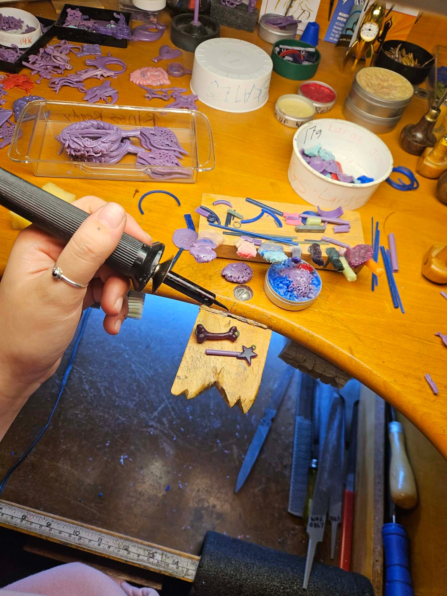 Once I have a design in mind that I would like to bring to life, I use a variety of different waxes and tools to carve and sculpt a physical piece.