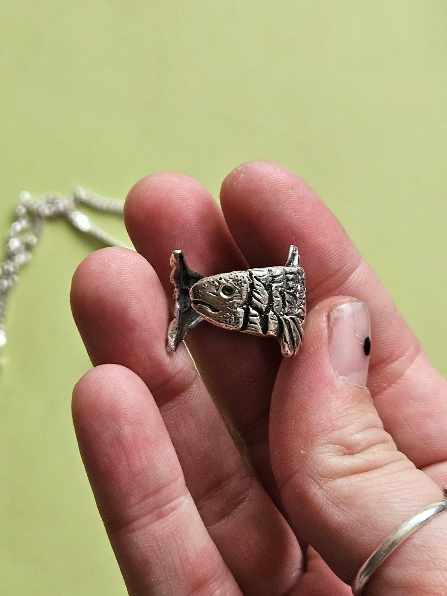 What you see here is SOLID recycled sterling silver! During casting, molten silver was poured into the wax, dissolving it and leaving behind solid metal pieces. Again - can you spot the fish?!